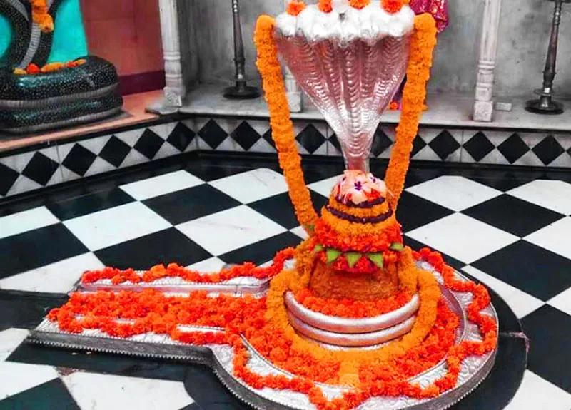 Nageshwar Jyotirlinga decorated with marigold flowers and serpent hood in its temple sanctum near Dwarka