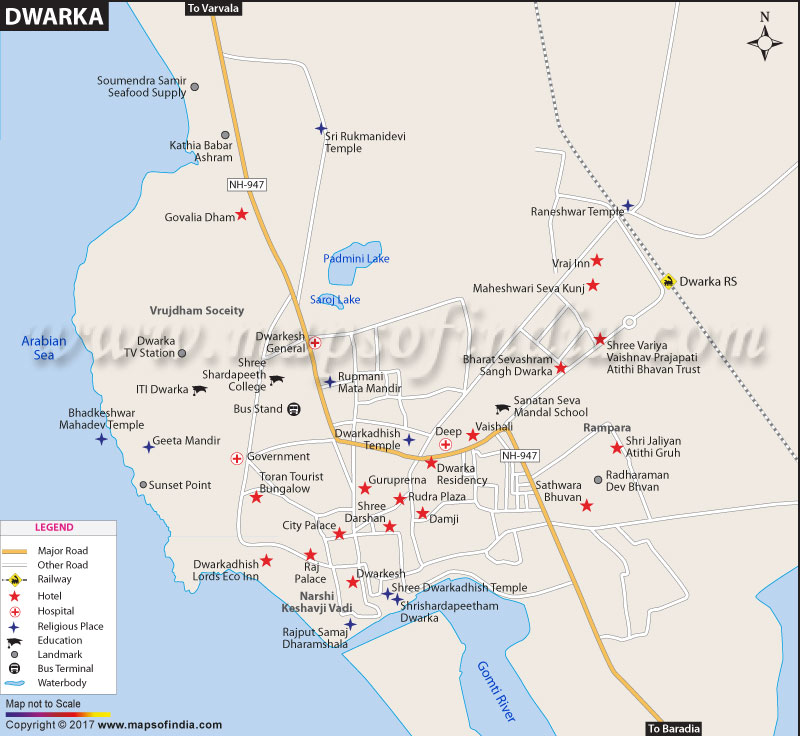 Dwarka city map showing key landmarks, roads, and tourist spots including temples, transport hubs, and accommodation